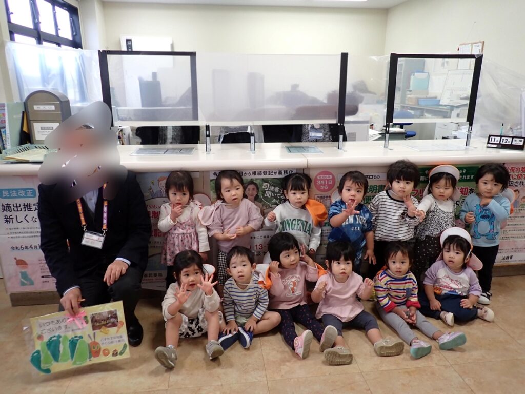 勤労感謝の日のプレゼントを届けに東海支所、JAみやざき東海支店に歩いていきました。東海支所について「おはようございます」と挨拶をすると支所の方が「かわいい~」と言ってくれてニコニコな子どもたちでした。最後にみんなで記念撮影をしました。