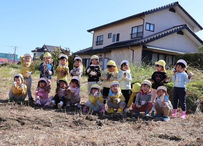 芋掘りに参加しました。自分達で植えた苗が芋に実っていることに驚いていました。「どこにお芋あるかな」と友だちと話をしながら、一生懸命芋を掘ると、芋が出てきて「やった!!」と、喜んでいました。掘ったお芋は、おやつや給食で美味しくいただきました。