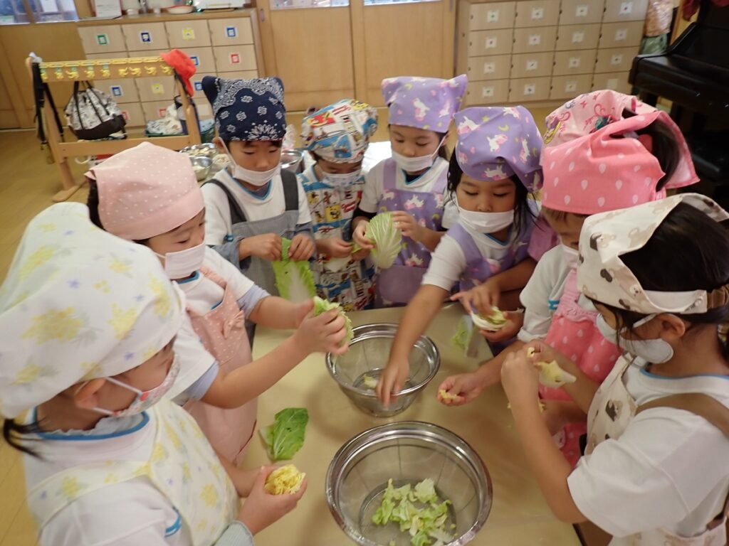 豚汁づくりをしました。初めて包丁を使う子どもが多く、大根と人参をとっても慎重に切る子どもたちでした。野菜の感触やだし汁の香りに興味津々で、白菜を手でちぎるとパリパリという音がしている事に気づき、友だちと嬉しそうに話をする姿も見られました。自分たちで作った豚汁はより一層おいしかったのか、嬉しそうに何度もおかわりしていました。