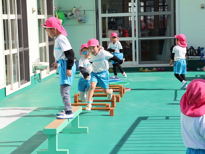 テラス遊びで運動あそびをしました。体を動かすことが大好きな子どもたち。平均台、ラダーバー、雲梯、フラフープ、縄跳びなどを楽しんでいました。平均台では、落ちないように慎重に歩こうとしたり、ラダーバーを飛んだりと上手くできると喜んでいました。できるようになったことが増えてきたので、もっといろんな事にチャレンジしていきたいです。