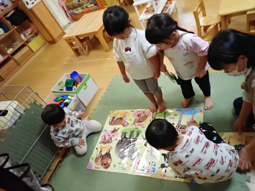 動物の巨大パズルをしました。最初はどこに置けばいいのわからず苦戦していましたがお友達と「ライオンさんだからあっちじゃない?」、「ゾウさんこっちだよ!」と協力していました。パズルが完成すると「やったー!できたよー!」と大盛り上がりでした。もっといろいろなパズルに挑戦していきたいです。