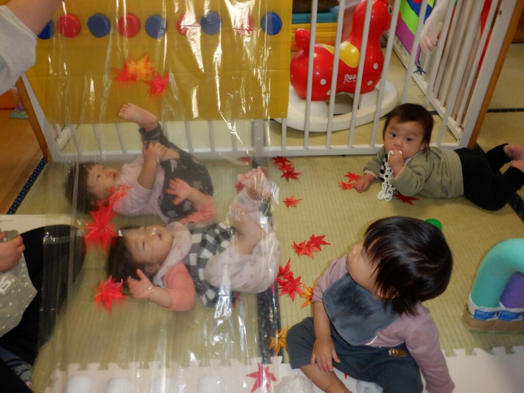 紅葉の造花で遊びました。初めは「何だろう?」とじっーと観察したり、恐る恐る手を伸ばして触っていた子どもたちでしたが、ビニール袋のすべり台の上を滑らせたり、葉を散らしたり遊びを色々と展開していくと自分でビニールの下に潜り込んで葉っぱの動きを見たりして楽しんでいた子どもたちでした。