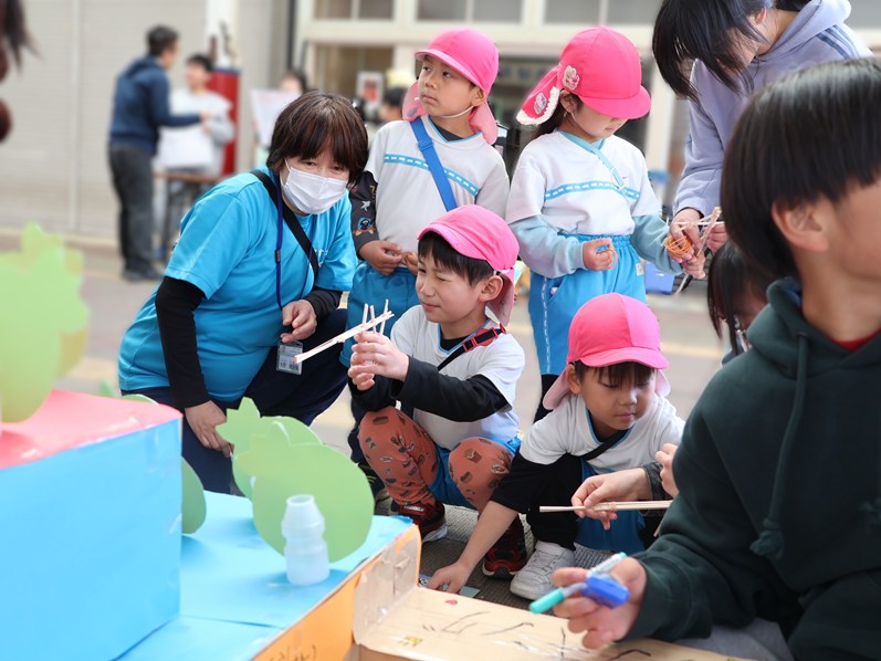 山下新天街で行われた「岡富っ子祭り」に参加しました。岡富小学校の小学5年生のお兄さん、お姉さんから教えてもらいながら、割りばし鉄砲や魚釣り、ボーリングなどの様々なゲームを楽しみました。割りばし鉄砲のコーナーでは、倒れにくい的を頑張って狙ったり、的を倒すことが出来ると嬉しそうにしていた子どもたちでした。