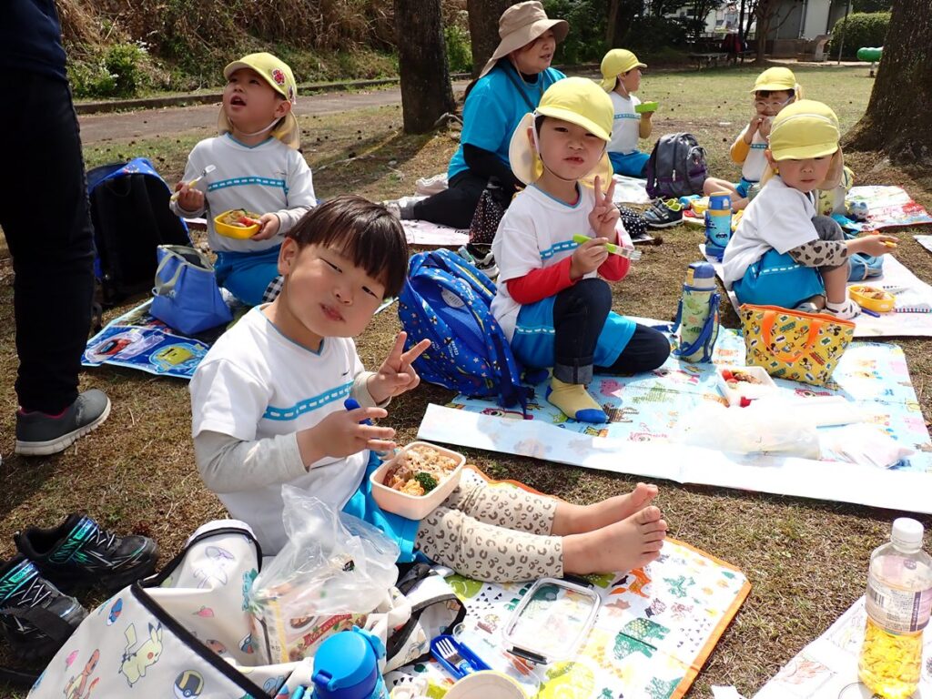 ふれあい公園へお別れ遠足に行きました。アスレチックでたくさん体を動かし、年長・年中児としっぽ取りゲームを楽しみました。遊んだ後は楽しみにしていたお弁当とお菓子タイム。シートを敷いてお弁当を見せ合い、会話を楽しみながら美味しそうに食べる子どもたちでした。