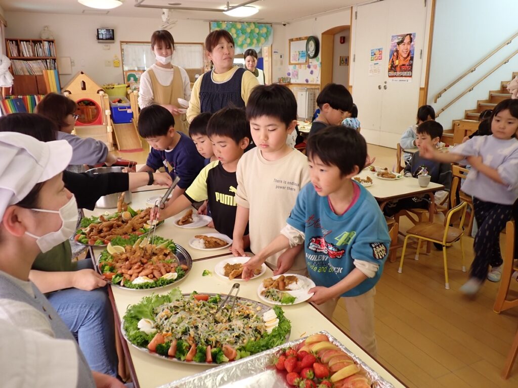 お楽しみメニューの日にカレーバイキングをしました。エビフライやからあげ、ウィンナーなどの好きなおかずを、自分で量を決めて盛りつけました。デザートのゼリーやジャムサンドに大喜びで「またおかわりいっちゃおうかなぁ!」と言いながら、楽しそうにお友だちと食べていました。