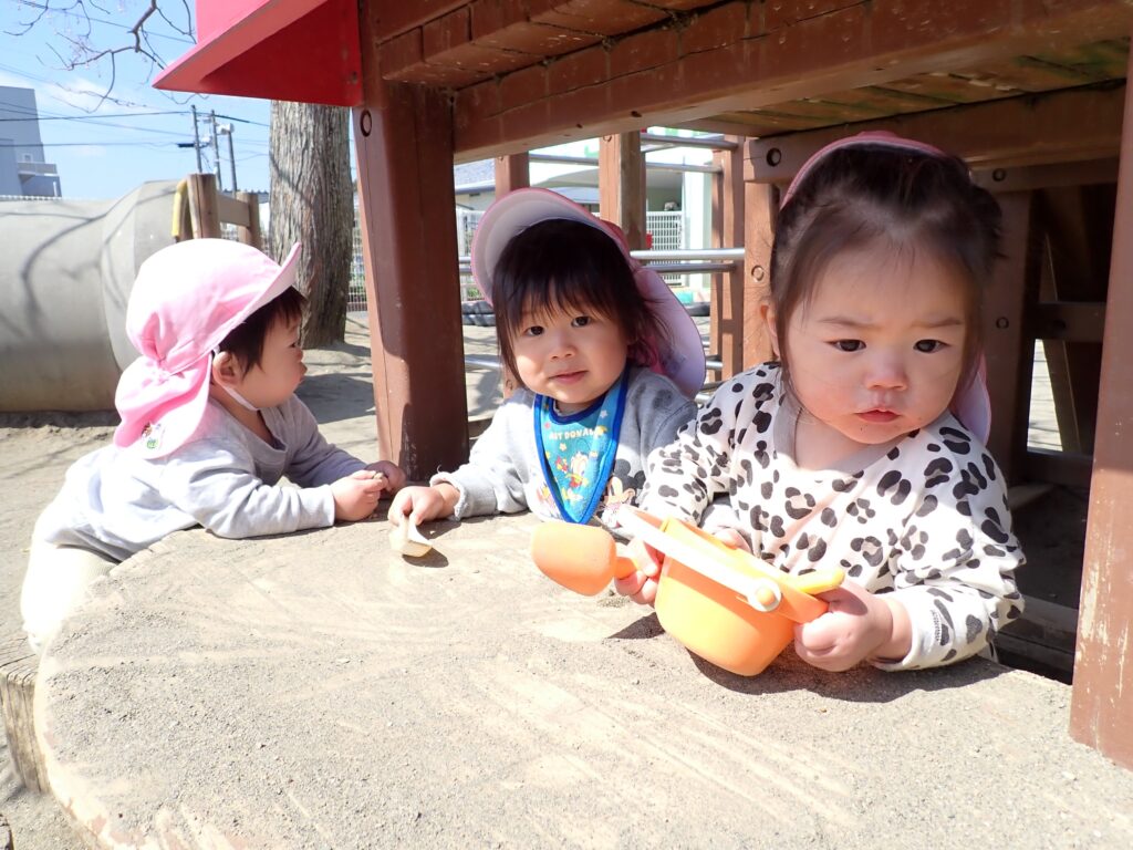 アスレチックにあるテーブルでごっこ遊びをする姿が見られるようになりました。保育士が「いらっしゃいませ~」や「どうぞ~」など声をかけると、一緒に『どうぞ~』お皿を友だちに渡したりしています。ままごと遊びが少しずつできるようになり、友達と簡単なやりとりを楽しんでいます。