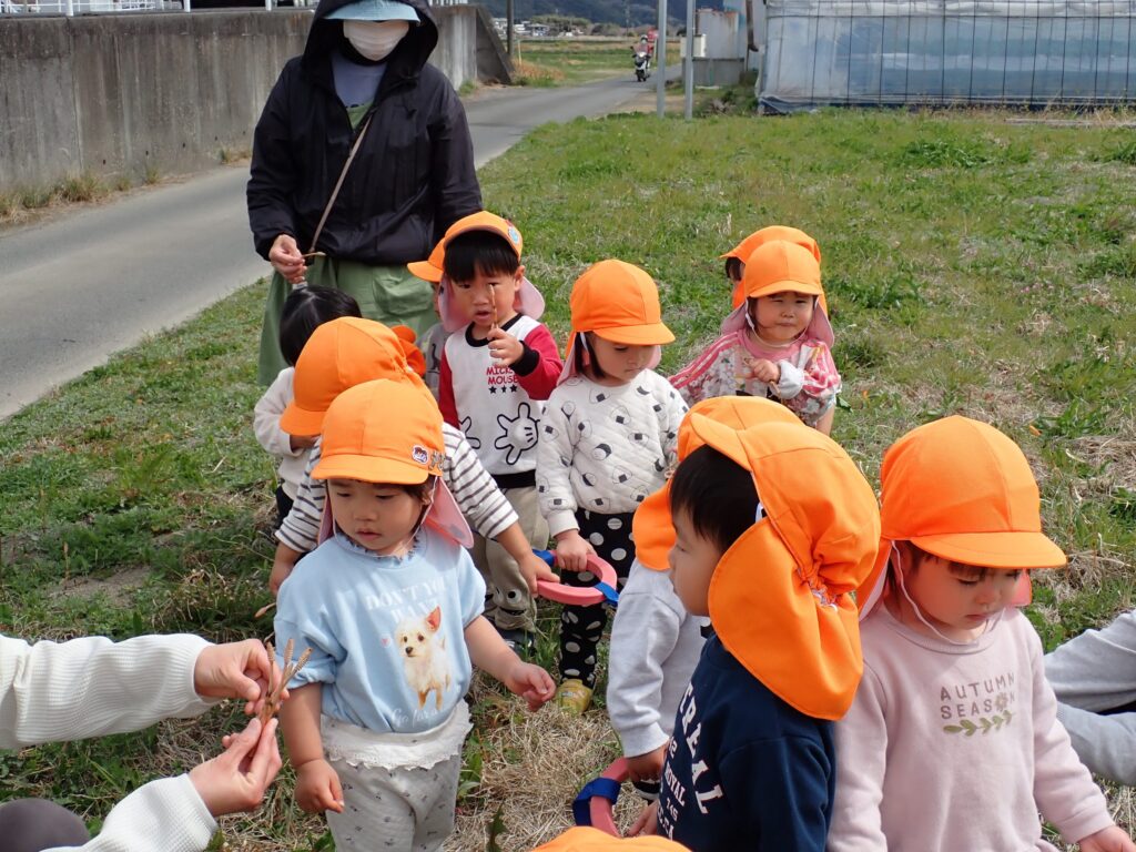 むしかセンターの近くの広場までお散歩に行きました。つくしを見つけると嬉しそうに集めはじめ、落とさないように握りしめて園に持ち帰ってお部屋に飾りました。天気も良く春の訪れを感じながら楽しくお散歩できた子どもたちでした。