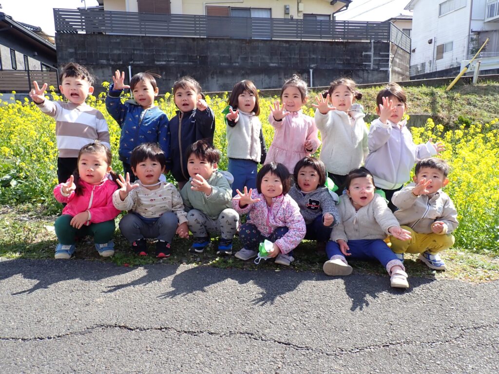 千代ヶ丘方面へ散歩に行きました。その道中でたくさんの菜の花を見つけ、写真を撮りました。上手にポーズを決めていましたよ。ちょうちょも飛んでいて「きれいだね~!」と嬉しそうに観察し、春の自然に触れることが出来て喜んでいた子どもたちでした。